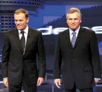 Donald Tusk bardzo się starał, aby w żadnej odpowiedzi nie pokazać, że zgadza się z Aleksandrem Kwaśniewskim. Wymagało to od lidera Platformy niezłej gimnastyki. I tak gdy Kwaśniewski jako możliwy termin zastąpienia złotego przez euro podał rok 2012, to już Tusk mówił, że powinno to nastąpić "tak szybko, jak to tylko możliwe". ...